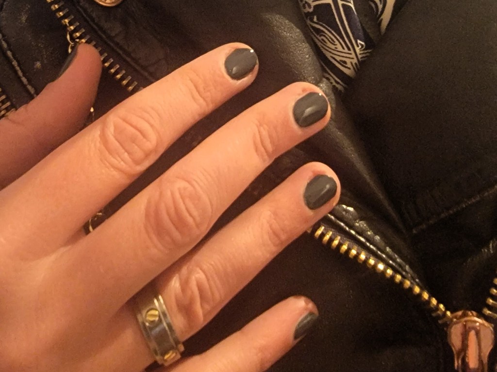 The vegan and cruelty-free brand describes this shade as ‘a metallic black hue’. I don’t quite see it – to me the name provides a much stronger description: a dark grey the colour of a rock you’d find in the forest, permanently damp which adds to the depth of the grey, with a barely perceptible hint of green moss that catches the light. Unlike any grey I’ve come across, it’s a strong colour that takes you a bold step away from the ‘boring’ label grey can illicit.